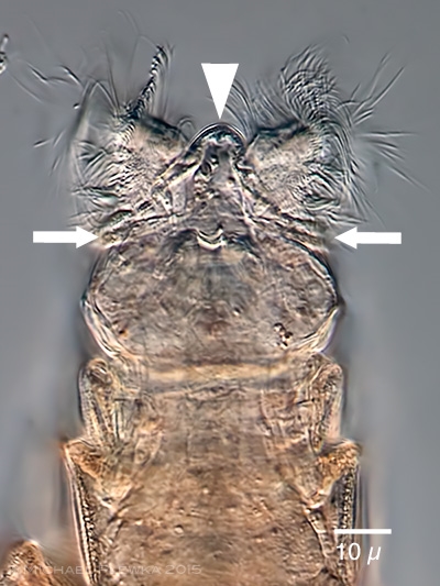 Auffällig ist neben der roten Farbe des Mageninhalts die Hautfalte, welche vom Lendenpseudosegment gebildet wird und die den Fuß beim Rädern überdeckt. Der Mageninhalt liegt, wie bei Habrotrochiden üblich, in Form von Pillen vor (das Magenrohr fehlt). Für die Gattung Otostephanos ist eine Spange charakteristisch, die den Kopf in Höhe der Trochalscheiben umgibt. Im Gegensatz zur ,,terrestrischen" O. auriculatus, die ich hier schon mal vorgestellt habe (Bilder hier:http://www.plingfactory.de/Science/Atlas/KennkartenTiere/Rotifers/01RotEng/source/Otostephanos%20auriculatus.html), ist diese Spange bei O. jolantae nicht so deutlich ausgeprägt, aber dennoch erkennbar (Pfeile in den beiden Ausschnittsbildern; links Dorsal-, rechts Ventralansicht; die Pfeilspitze deutet auf die Oberlippe, ein weiteres wesentliches Merkmal für die Bestimmung):