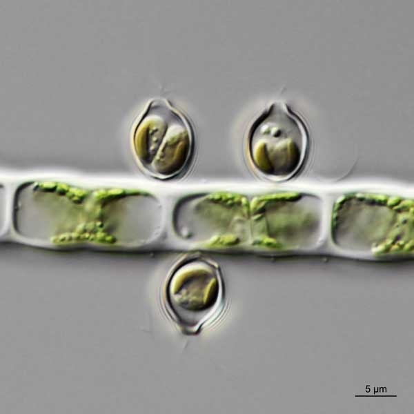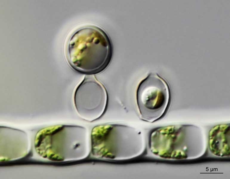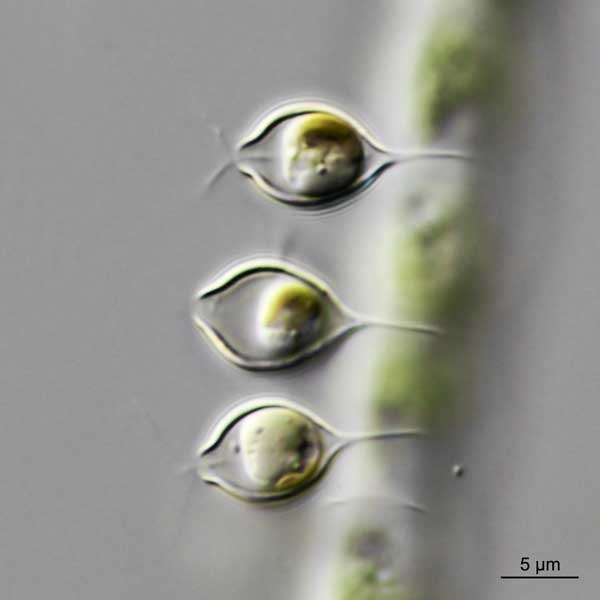 Im Gehäuse oben links sind die beiden durch Zellteilung gebildeten Tochterzellen zu sehen.