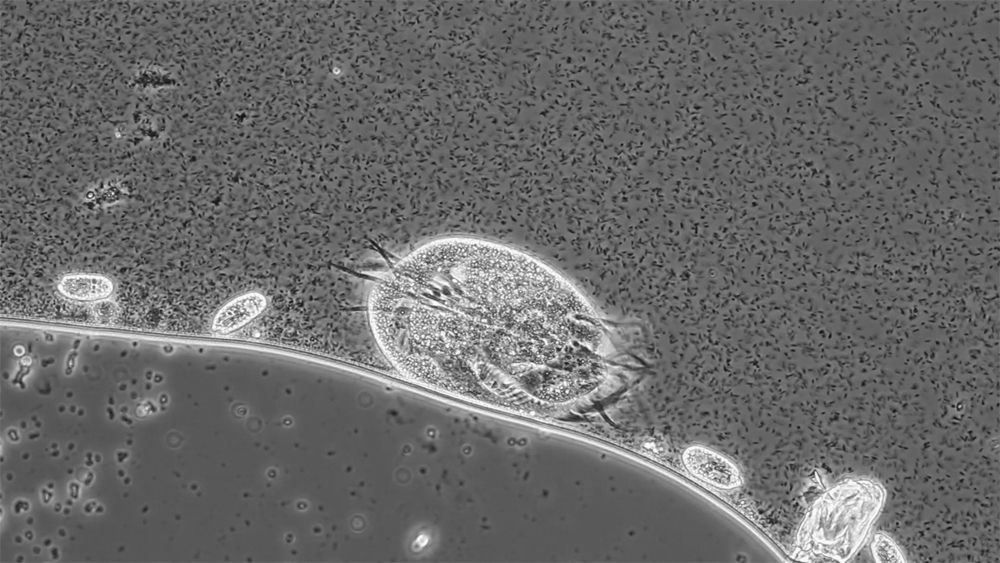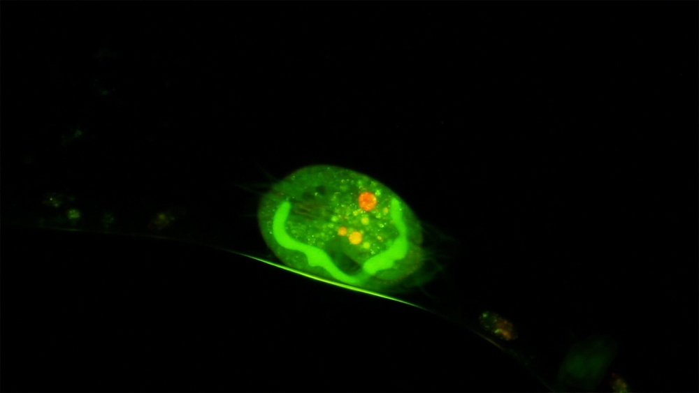 Hier hat sich ein Ciliat der Gattung Euplotes bereits festlich beleuchtet und als Oster-Ei verkleidet.