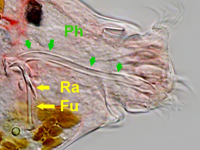 Sehr schön zu sehen ist das Pharyngealrohr (Ph),  mit dem die Nahrung (Phytoflagellaten, in diesem Fall waren Dinobryon, aber auch Ceratium dominierend) ausgesaugt wird, sowie Teile des Kauers (Rami und Fulcrum):