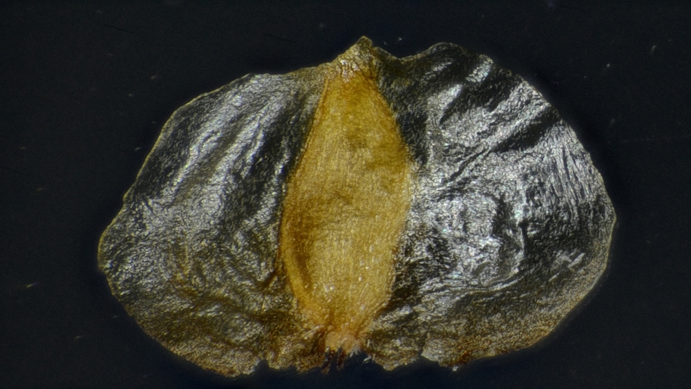 PS: Die große Zahl der Bilder wäre nicht notwendig gewesen, hätte sich alles auf einer Ebene abgespielt. ABER: Der schwarze Hintergrund hat eine recht grobe Struktur. Nun habe ich den Samen auf einen Objektträger gelegt und mit zwei Schächtelchen für Deckgläser für Abstand zum Hintergrund gesorgt. Resultat: Im Objektträger spiegelt sich das Ringlicht. Also musste ich den Objektträger etwas schräg positionieren. Auf einer Seite etwas höher als auf der anderen. Damit war die Spiegelung weg, aber die Anzahl der Bilder wuchs...