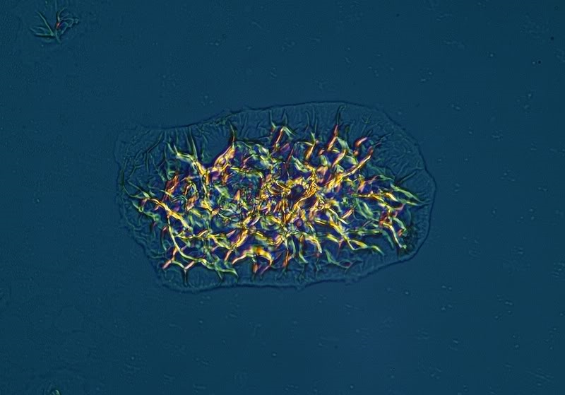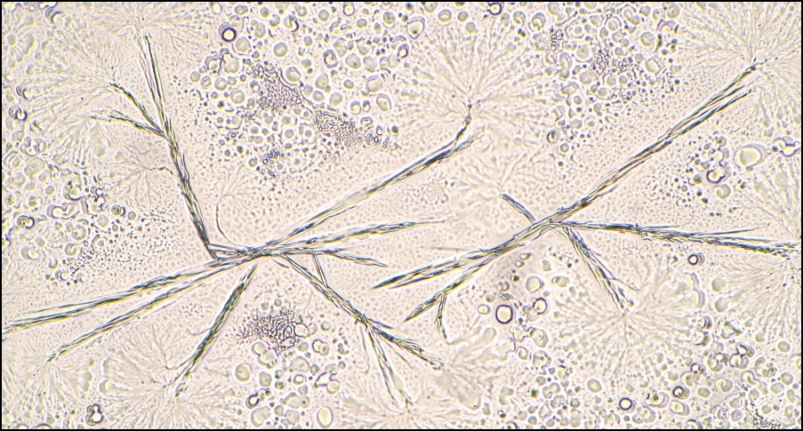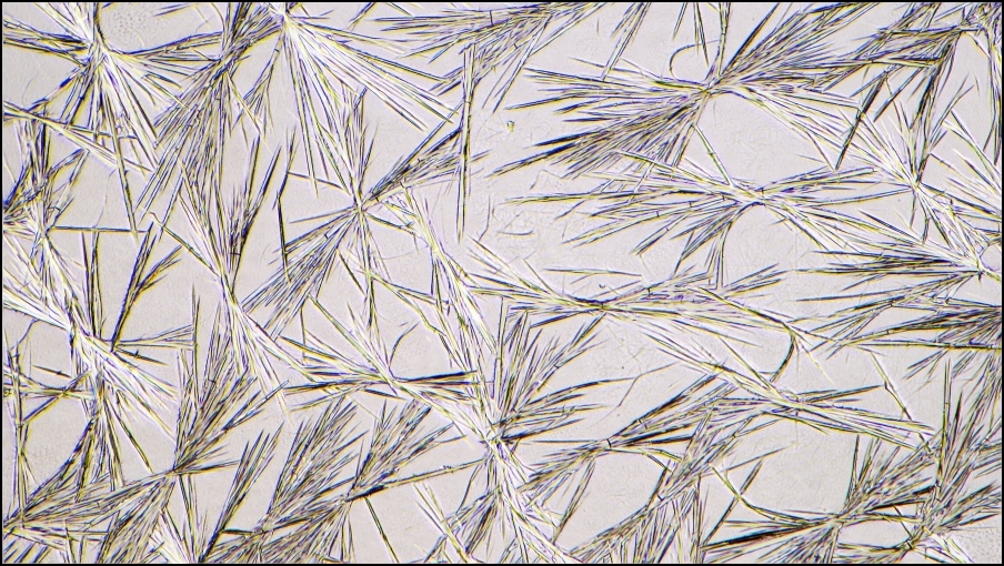 Diesmal eine etwas größere Ansammlung von Kristallen. Die fand ich allerdings an einer völlig unerwarteten Stelle des Objektträgers. Statt die Birken(teile) (ich habe diesmal frische Samen genommen) auf einem Objektträger aus Glas der Flamme auszusetzen habe ich diesmal einen Metalldeckel eines Honigglases genommen. Der zerplatzt nicht bei der Wärmeeinwirkung 8). Viele Kristalle sind auf diese Weise nicht zu gewinnen. Aber zur Demonstration reicht es.