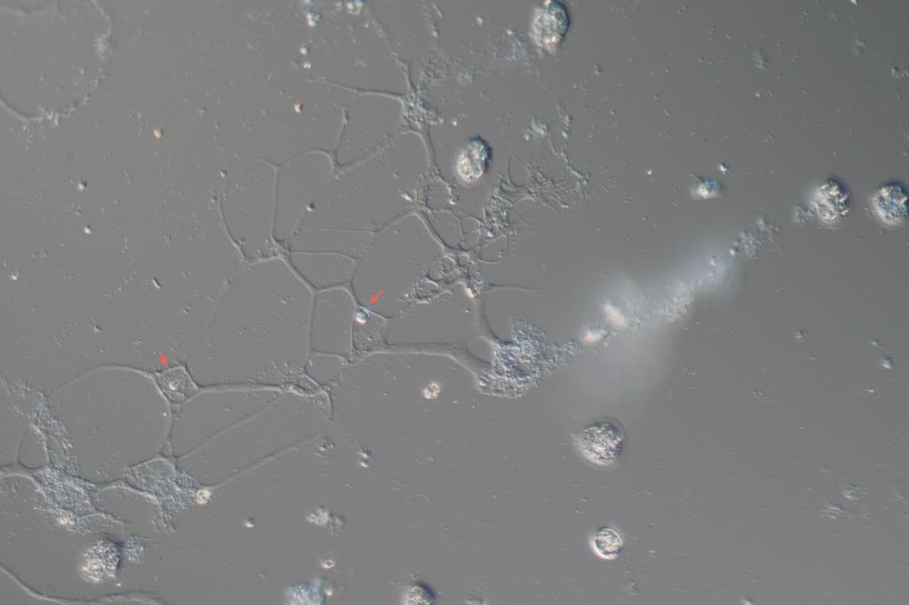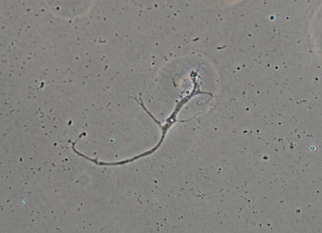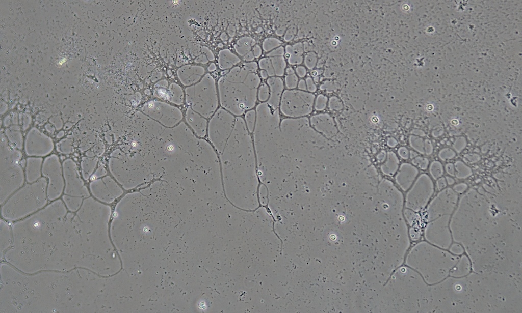 ursprünglich war in meiner Kultur ein halbes Dutzend Cochliopodium Amöben, das Plasmodium sowie ein paar einzellige Algen. Vor 3 Wochen kam das Plasmodium mit den Cochliopodium Amöben in Kontakt. Die Cochliopodium Amöben setzen sich auf ein Filopodium und fressen es. Anscheinend scheint das Plasmodium gute Nahrung zu sein, ich hatte nach einer Woche bestimmt 100 Cochliopodium Amöben und nur noch Reste des Plasmodiums. Nun scheint eine Art Equilibirum hergestellt zu sein. Das Plasmodium hat sich wieder stabilisiert und die Cochliopodium Amöben fressen von ihm, ohne es zu zerstören (Bild 1).