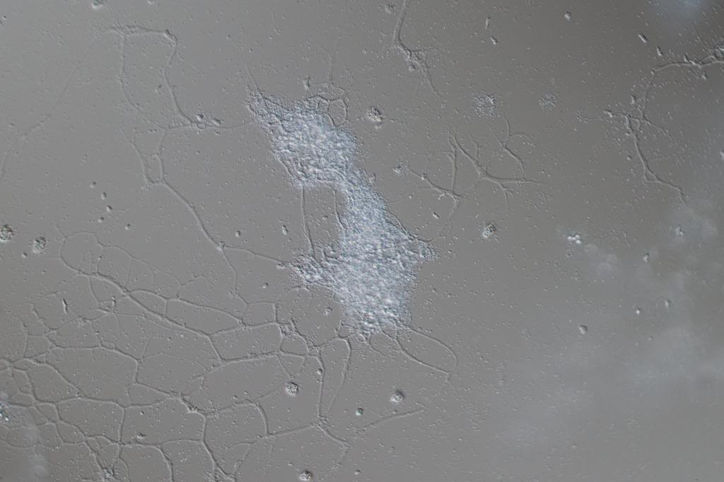 Am nächsten Tag war von der Amöbe nichts mehr zu sehen. In einer parallel angesetzten Kultur fand ich sie aber wieder. Hier hat sie sich von einer Zyste ringförmig ausgebreitet. Man kann erkennen, wie der "Rasen" von ihr abgegrast wurde. Die Amöbe bildet ein Netzwerk aus anastomisierenden Filopodien. Dieses Netzwerk kann sich trennen und wieder vereinigen. Die hier gezeigten Übersichten sind nur kleine Ausschnitte des Rings. Ich habe zu einem Zeitpunkt 40 getrennte Plasmodien gezählt. Allerdings gerät sie nun in den Bereich, den die Cochliopodium Amöben besiedelt haben. Mal sehen, wer gewinnt :D