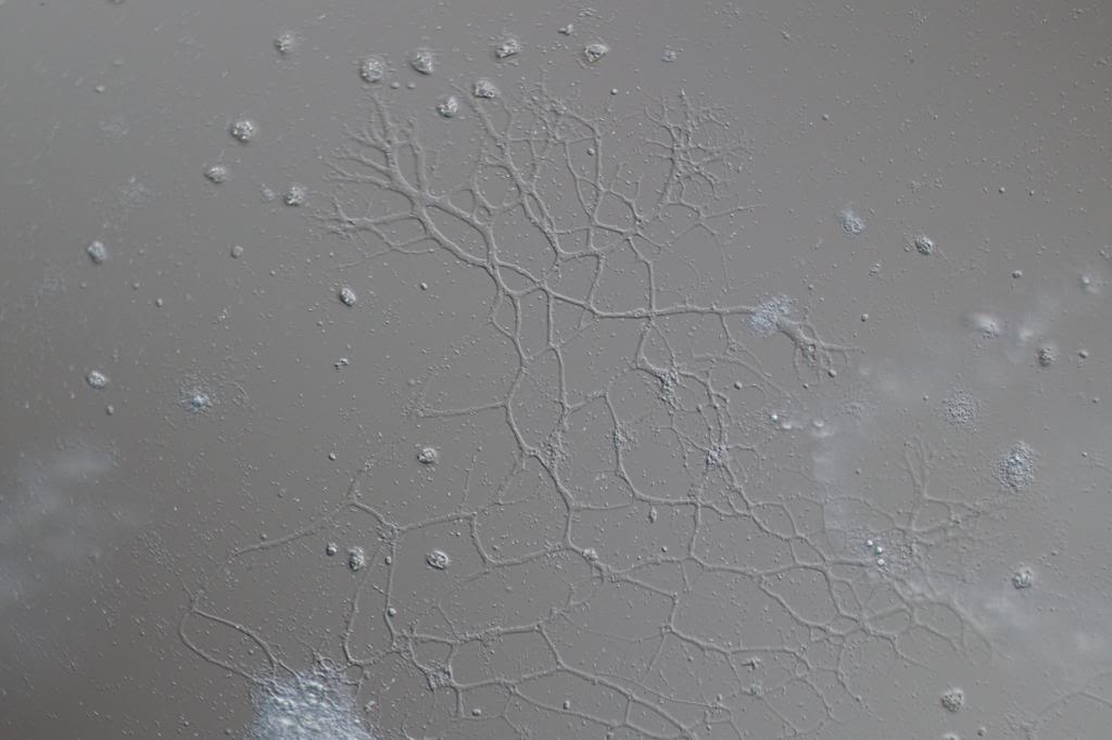 Solche verzweigten Plasmodien habe ich oft gefunden: in Wegpfützen, Blumentöpfen, einem österreichischen Moor und sogar einer Bromelienrosette - zuletzt 2002. Ich habe nun wieder einen Versuch mit einem früheren Fundort, einem überwässerten Kaktustopf, gestartet, bisher ohne Erfolg.