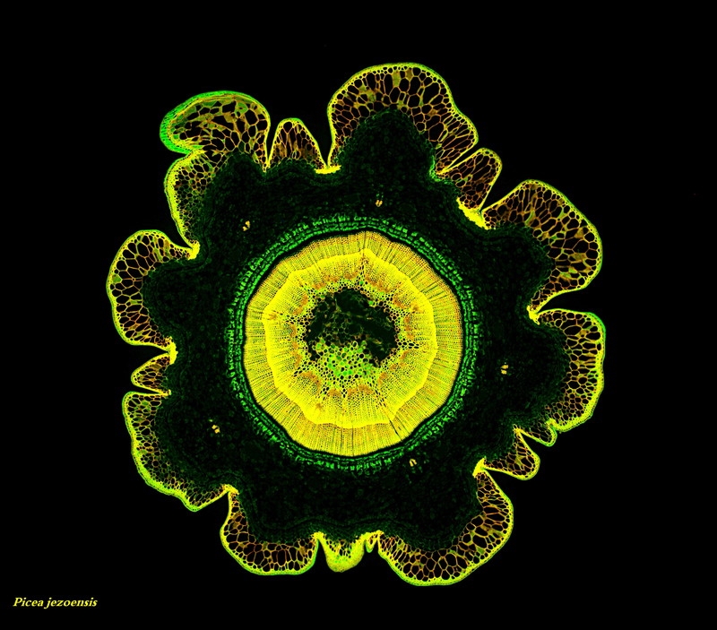 ich "kapere" mal deinen wie immer schönen Beitrag mit 2 Bildern, die sowohl Lob als auch Dank an dich sind für deine "Rettung" des Wohldenbergtreffens. Was hätten wir gemacht ohne deine wunderschönen Schnitte! Ich war sicher nicht der Einzige, der immer 2 Schnitte verbraucht hat, weil ich ja zur Wacker W3 ASim II Farblösung noch die klassische Etzold blau angesetzt hatte. Mal war die eine attraktiver mal die andere. Hier die exotische Ajan-Fichte in der Wackerfärbung, die natürlich in der Auflichtfluoreszenz was her macht durch das Acriflavin. Toll, wie das filigran luftige Gewebe ohne Riss zusammen gehalten hat.