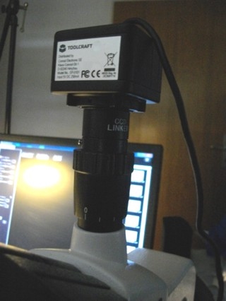 1. Die Kamera kommt auf den Fototubus des Trino. Das ist suboptimal, weil sie so nur ein Drittel des Lichts bekommt und z B Dunkelfeld nicht mehr machbar ist. Wenn ich sie in ein Okular stecken und den Schieber des Trino "ausschalten" würde, hätte ich mehr Licht. Das Problem ist, dass der mitgelieferte Adapter nur extrem schwer in den Tubus zu drücken ist; ich habe Angst, etwas zu demolieren und verwende das Teil überhaupt nicht. Stattdessen nehme ich den C-Mount-Adapter (ohne Linse), der dem Müller Mikroskop beigelegt war. Diesen stecke ich ohne weitere Optik in den Fototubus. Der Bildausschnitt, den man dabei bekommt, ist etwa das mittlere Drittel dessen, was man im  Okular sieht. Schaut man abwechselnd ins Okular und auf den Bildschirm, hat man das Gefühl, dass die Kamera stark "herausvergrößert". Macht mich nicht unglücklich.