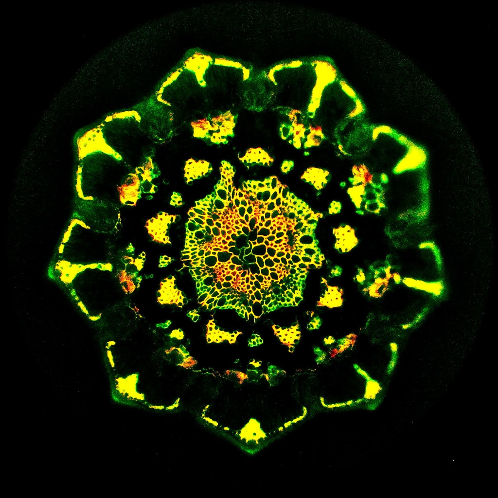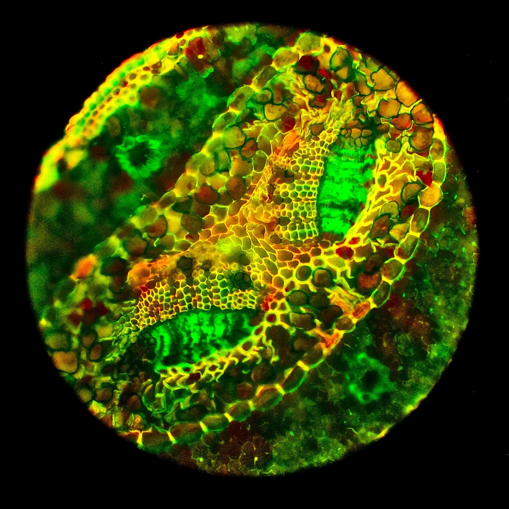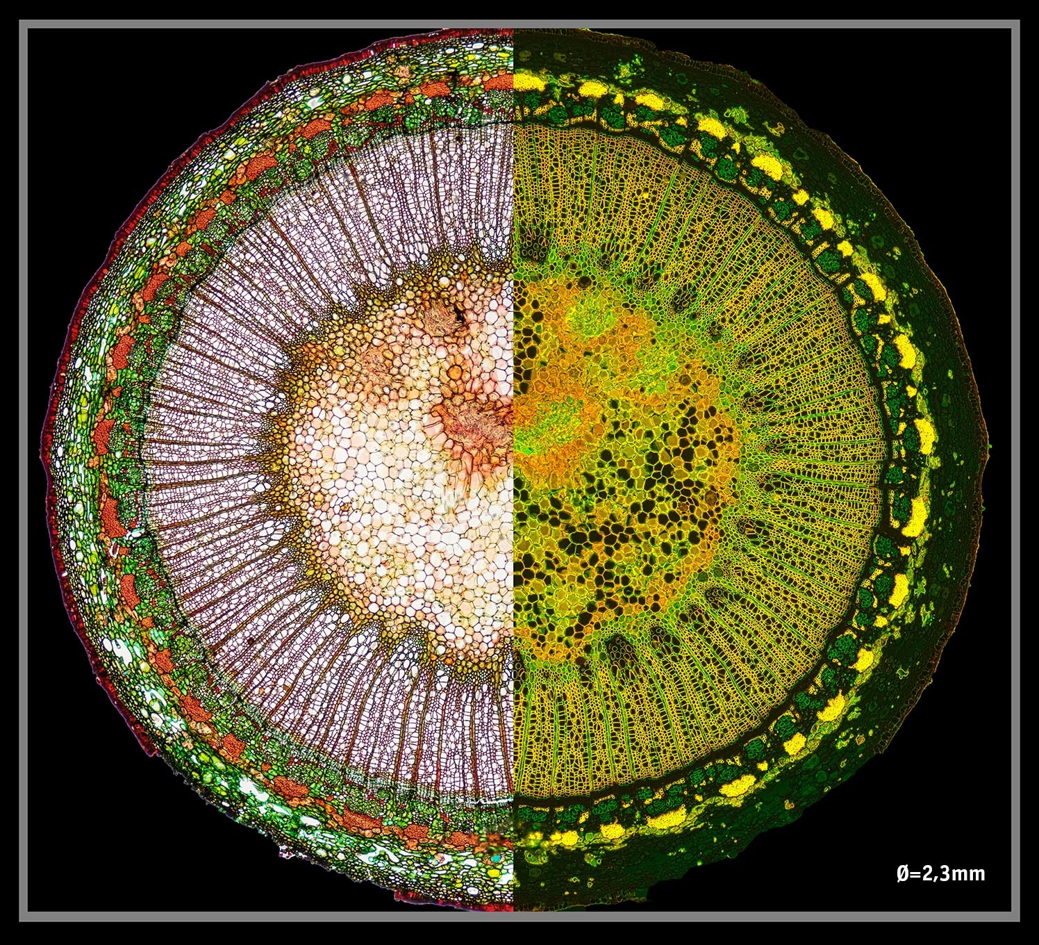 Ich will jetzt nicht kapern, aber ich habe zur Verdeutlichung einmal eine Gegenüberstellung Hellfeld/AL-Fluo gemacht an einem Spross einer Magnolie (40µm) mit W3A sim gefärbt, die ich euch zeigen möchte.