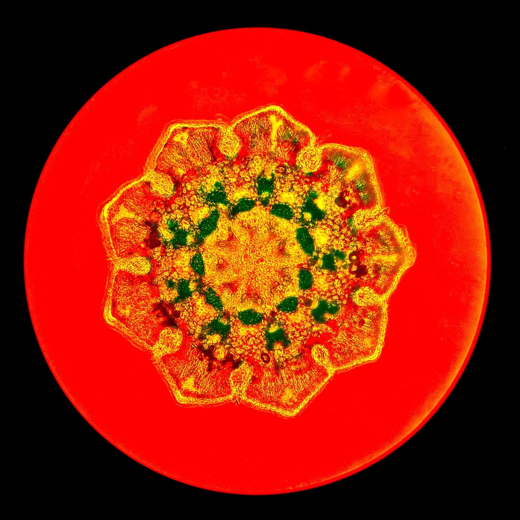 Soviel ich weiss, hat der Kollege die Schnitte mit einem kleinen Rasierklingenmikrotom geschnitten, kräftig mit W3A gefärbt, nicht differenziert und die Deckgläser nicht beschwert......