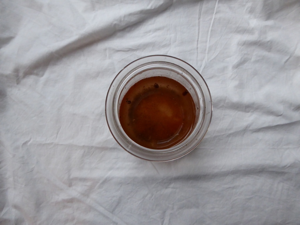Die Proben habe ich lange in Einmachgläsern auf einem Fenstersims aufbewahrt. Vor unserem Spitzbergen-Urlaub und zu befürchtenden Temperaturen um die 35°C habe ich die meißten Proben entleert. Ein Einmachglas hat über die Zeit immer Regenwasser eingefangen. Ich habe jetzt bemerkt, das dieses eine Einmachglas tief rot aussieht. Und da dort nichts drin ist, was rosten kann, ist das doch ein Grund, das mal unter das Mikroskop zu legen.