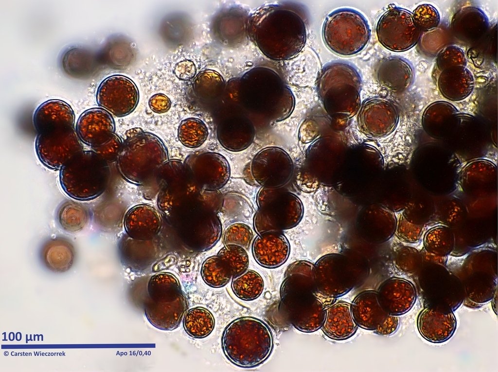 Die Alge ist auch oft mit Rädertieren vergesellschaftet, sie sich an ihnen laben und dadurch ähnlich rot werden: