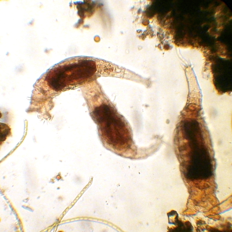 Gefunden habe ich runde Algen. Ich würde sagen, das müssen Rotalgen sein. Bestimmen konnte ich sie nicht. Teilweise liegen sie ganz rund einfach statisch rum, auch in großen Grupen, es gibt aber auch elliptische Schwärmerstadien. Die eine Geißel, die ich sehen konnte, konnte ich leider nicht ablichten.
