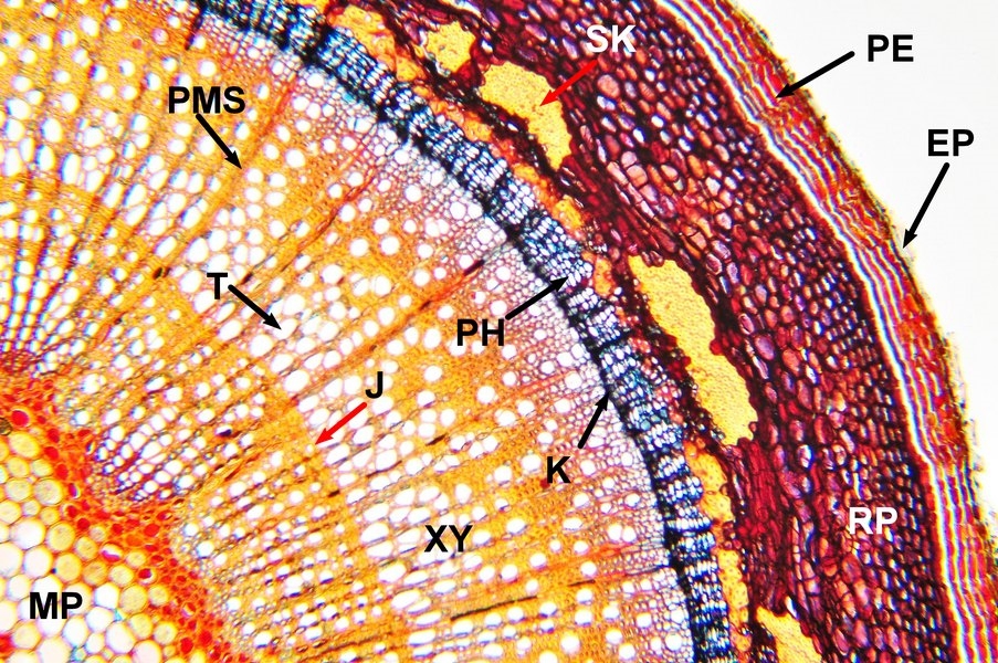 MP = Markparenchym, T = Trachee, PMS = primärer Markstrahl, J = Jahresringgrenze, PH = Phloem, SK = Sklerenchym – Inseln, XY = Xylem, K = Kambium, PE = Periderm, EP = zerrissene Epidermis ?