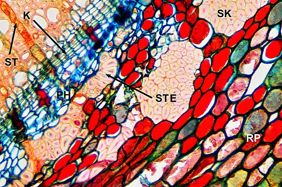 CU = Cuticula, EP = Epidermis, HY =  RP = Rindenparenchym, PH = Phloem, SK = Sklerenchym,  XY = Xylem, PH = Phloem