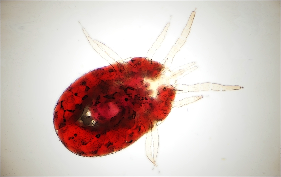 heute zeige ich eine präparierte Hühnermilbe (Rote Vogelmilbe - Dermanyssus gallinae) im Interphako.