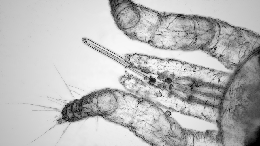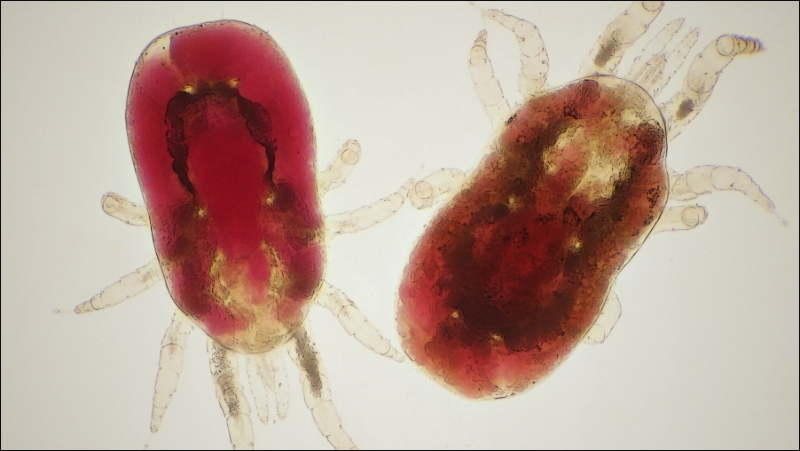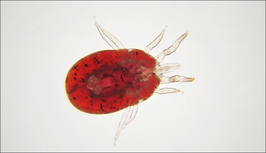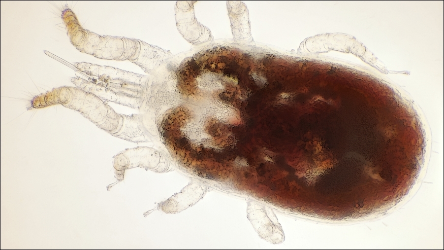 Auch ist gelegentlich ein zweiter und dritter Blick notwendig, um zu erkennen, dass das erste Viech (gemeint ist jetzt nur die Milbe) ja auf dem Rücken liegt, die Beäugung also bäuchlings erfolgte.