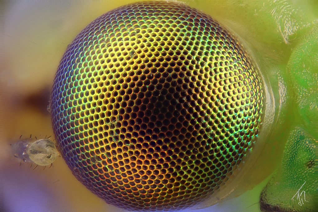 nachdem ich gestern auf dem Flohmarkt ein altes Mikroskop mit einem 5x und einem 20x Objektiv gefunden hatte und es sehr günstig, in der Hoffnung auf ein RMS-Gewinde der Objektive (Augenmaß), gekauft habe, habe ich nun endlich durch das 20x die Möglichkeit, stärker vergößerte Fotos zu machen (Es war glücklicherweise RMS). Zum Ausprobieren habe ich nochmal die Florfliege von neulich verwendet. Bei dem Objektiv handelt es sich um ein 20/0,3. Ich weiß nicht von welcher Marke es ist. Das gesamte Mikroskop war unbeschriftet. Ohne große Bearbeitung entstand das gezeigt Foto.  Das Objektiv scheint sehr gut zum Stacken geeignet. Zur Orientierung habe ich nochmal das Bild der ganzen Florfliege von neulich eingefügt.
