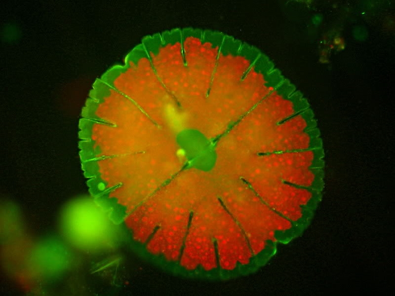 Ich habe mit dem 09er-Filterblock und der Royalblue-LED eine schöne intensive Acridinorange-Fluoreszenz. Bild ist zwar nicht super (es lag noch was auf der Micrasterias, und schief liegt sie auch noch dazu), aber die Fluoreszenz schon: