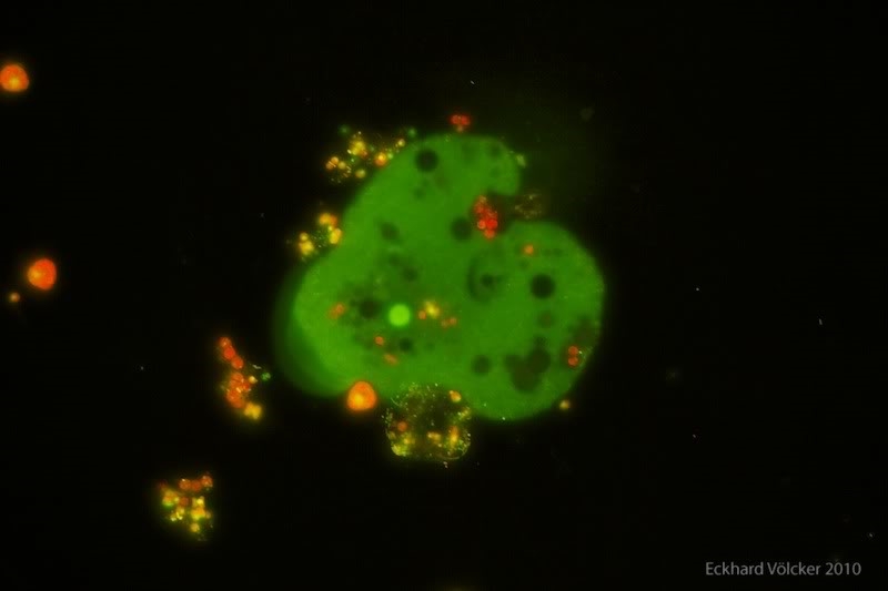 Amöbe in-vivo mit Acridinorange gefärbt. Zellkern hellgrün, Dictyosomen um den Zellkern orange, Cytoplasma grün. Bei den Algen kommt die rote Farbe durch die Autofluoreszenz des Chlorophylls zustande und der helle Punkt in der Mitte ist der durch Acridinorange gefärbte Zellkern.