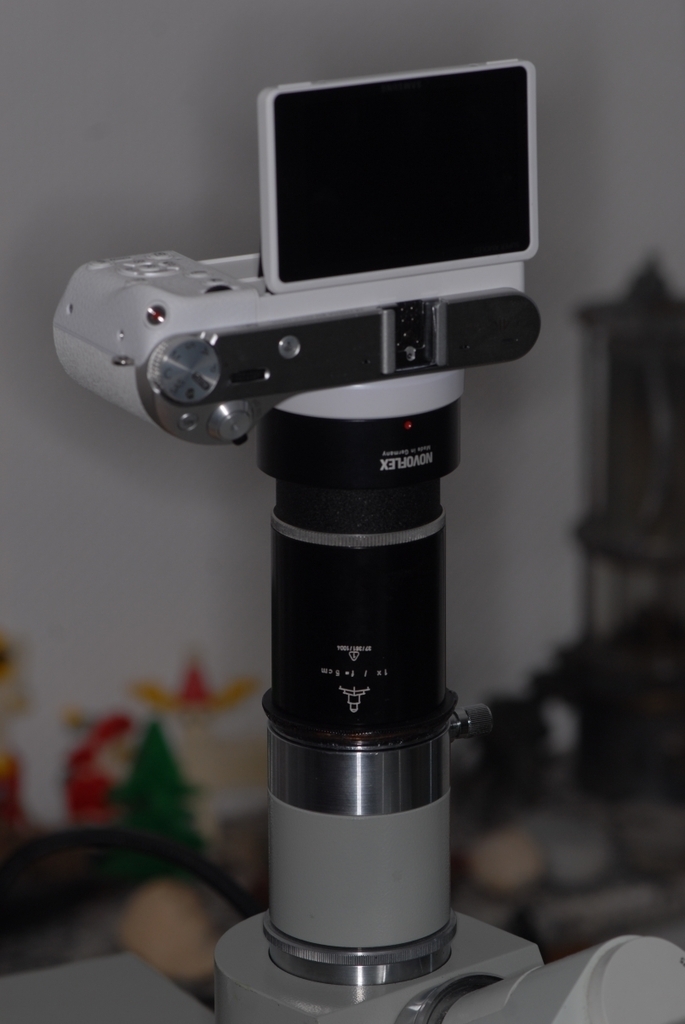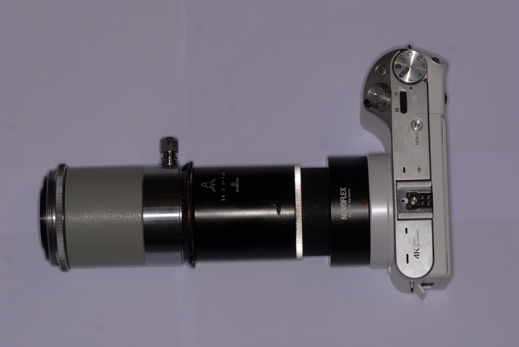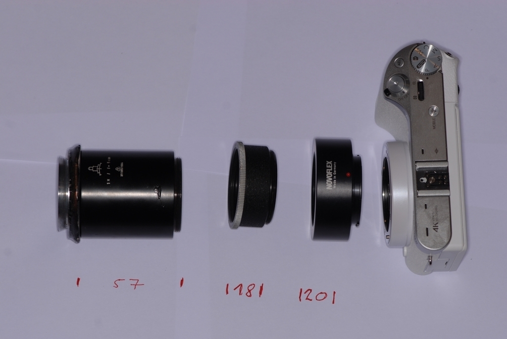 Auf die Kamera kommt ein SAMSUNG-M42 Adapter. Darauf einer der reichlich für kleines Geld angebotenen M42-Zwischenring-Sets. Wie bei meinem alten Olympus-Adapter muss man die Zeiss-Jena-Ringschwalbe mit 2K-Kleber auf den letzten Ring der Zwischenringe aufkleben. Fertig. Heute ist der Zwischenring-Set angekommen, ich musste sofort basteln und die ersten Fotos schießen.