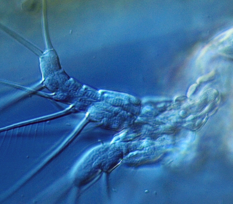 Das Bild oben ist stark verkleinert, unten noch ein Ausschnitt in Originalgröße. Man sieht ganz gut die quergestreifte Muskulatur im Nauplius-Ärmchen. Hat einen ganz ordentlichen Bizeps, das kleine Ding, aber die Algen waren stärker ...