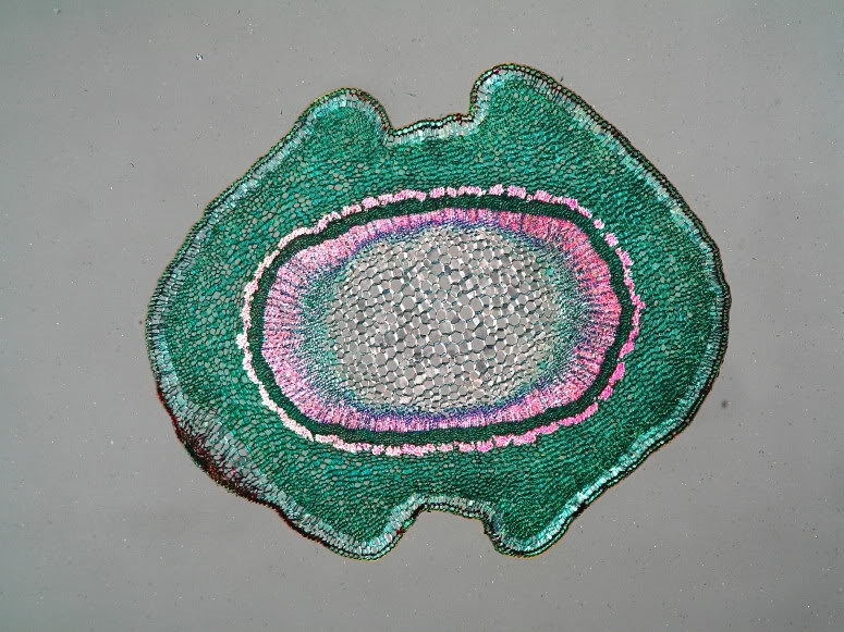 Das Xylem ist hier, wie in meinem Galium, in einem geschlossenen Ring angeordnet, unterbrochen durch viele Strahlen, die aus lebenden Zellen bestehen (daher blau), die physiologisch die Verbindung zwischen Xylem und Phloem darstellen.