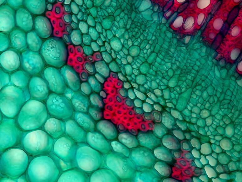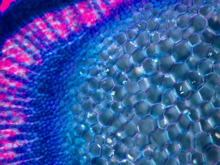 Das Phloem bleibt dünnwandig, ohne Lignifizierung, daher blau gefärbt. Die Siebröhren, also die Elemente, die den Zucker und anderes entgegen dem Transpirationsstrom transportieren, sind immer als etwas größere Zellen erkennbar, denen die Gelleitzellen als kleine "Kappen" aufsitzen. Und dazwischen sind auch hier, wie im Xylem, die radiär verlängerten Strahlzellen erkennbar, die Xylem und Phloem physiologisch verbinden und lebende Protoplasten enthalten. Das werde ich später nochmals an einem anderen Beispiel erläutern.