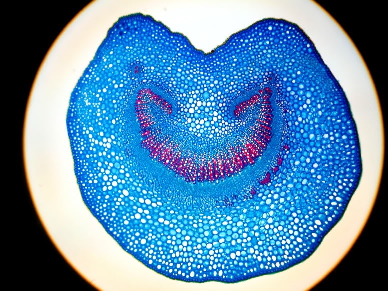 Das Xylem, vor allem die Tracheen, ist sekundär stark verdickt und sklerifiziert, daher rot gefärbt (Fuchsin färbt Lignin), denn es muss ja den Unterdruck durch den Transpirationsstrom aushalten.
