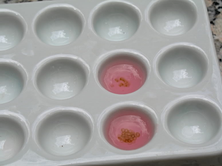 Das Färben geht im Dutzend schneller; dann sucht man die schönsten Schnitte aus und deckt sie ein. Ich färbe blau und grün nebeneinander in der Tüpfelplatte und verarbeite die Schnitte bis sie in Isopropaol liegen im gleichen Tüpfelplatten-Näpfchen. Hier liegen Stängel- und Blattstiel-Schnitte in AFE zum fixieren. (War noch ein Spur Fuchsin drin, deshalb ist das Fixiermittel rosa)