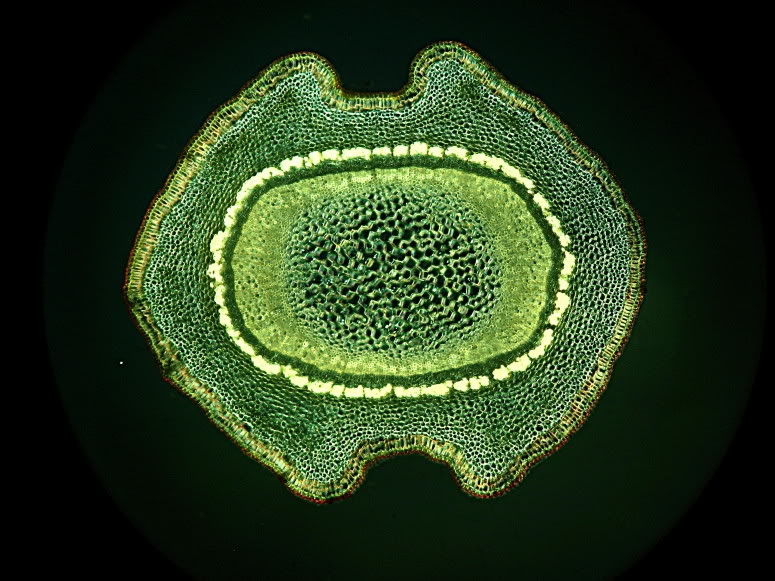 Interessant ist, dass der Umriss des Stängels sehr dem der Forsythie ähnelt, den ich hier schon gezeigt hatte und im "Mark" sind auch wieder Kristalle, die als Kristallsand um die Präparate verteilt sind. Ich vermute mal auch hier Ca-Oxalat.