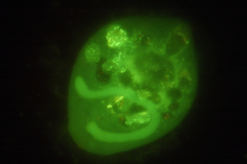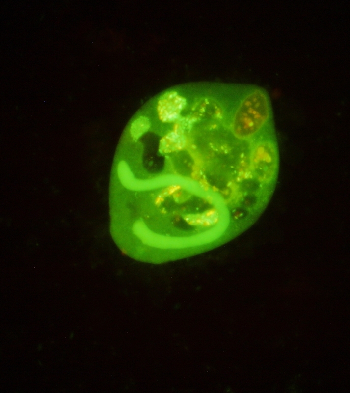 Du hast wahrscheinlich mit allem recht! Wie ich schon sagte war das mein erster eher spielerische Versuch, um zu sehen was passiert sozusagen. Ich habe also weder ein Protokoll über Konzentrationsstufe des AO, noch war das Ziel eine Lebenduntersuchung. Tatsache ist, dass sofort nach durchziehen des AO und sofortiger Untersuchung in AL-Fluoreszenz, zahlreiche leuchtende Glockentierchen herumschwammen. Ich habe einige Minuten beobachtet und erst als ich merkte, dass etliche Exemplare regungslos auf der Stelle lagen, habe ich überhaupt erst an fotografieren gedacht. Die Exemplare zeigten alle eingezogenes Peristom und waren entweder betäubt oder schon kurz vor der Lyse. Immerhin hatte ich Zeit in aller Ruhe mit der Ölimmersion draufzugehen. Die Makronuklei waren während der ganzen Zeit (4-5 Min.) unverändert.