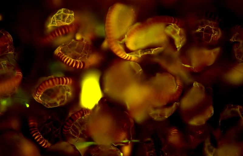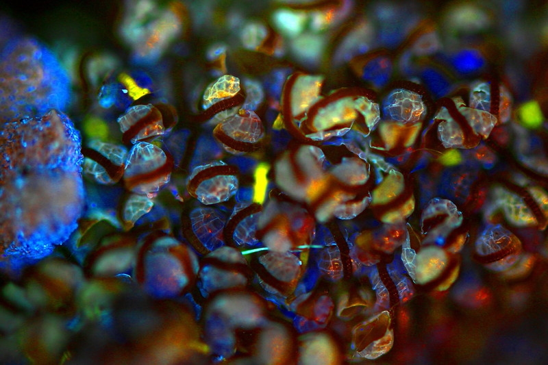 ich häng mich einfach bei dir rein, weils ja dazu gehört.Vielen Dank für die Probe. Ich habe eine ganze Reihe Aufnahmen gemacht, aber sehr Spektakuläres kam nicht dabei raus. Was mich besonders irritiert hat war, dass es keine Chlorophyll-Fluoreszenz gab, obwohl grüne Bereiche zu sehen sind, wie die Übersichtsaufnahme zeigt. Vielleicht war die Probe auch auf dem Weg vertocknet?