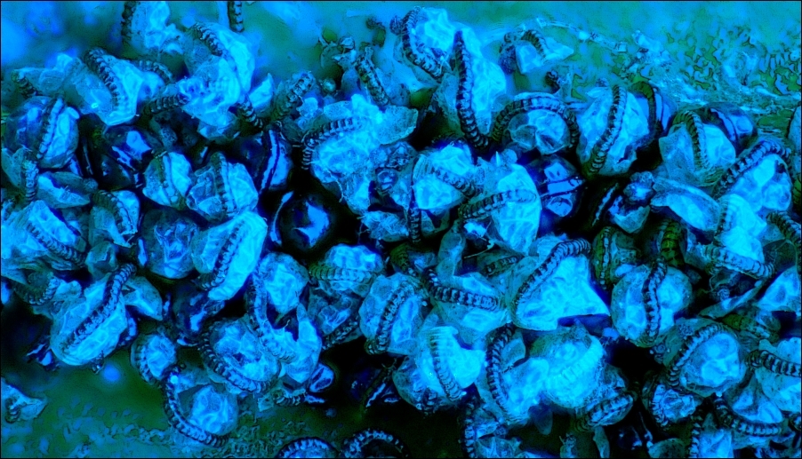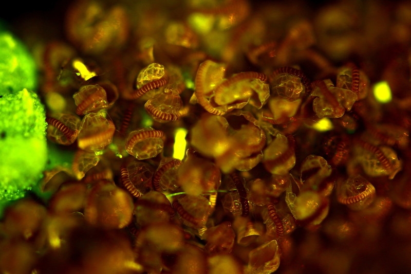 die Sache hat mir keine Ruhe gelassen, weshalb ich noch einmal Frischmaterial besorgt habe. Nach zig Versuchen mit Schwarzlicht und im jetzt gezeigten Foto mit 365nm-UV komme ich zu dem Schluss, dass es einfach zu spät im Jahr ist, die Sporangien sind alt und entleert ...
