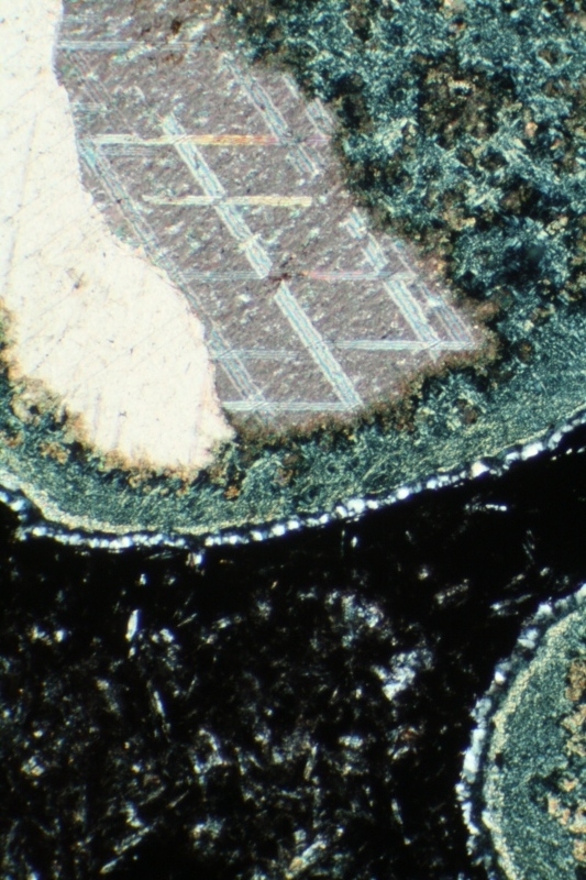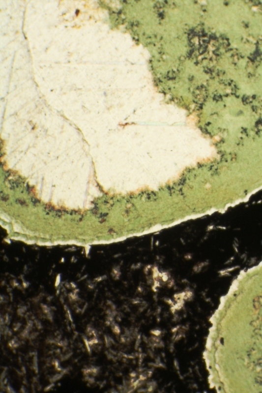 Hier mal ein Ausschnitt aus einem Schliff, den ich im Sommer hergestellt hatte. Es handelt sich um einen Mandelstein, d.h. ein vergleichsweise Kieselsäure-armes Gestein mit vielen ehemaligen Gasblasen (obere Bildhälfte und linke untere Ecke). Es sieht fast aus wie bei Bims, d.h. es ist ein Vulkanit, auch wenn es in Skandinavien, bzw. am Grund der Ostsee heute keinerlei Anzeichen von aktivem Vukanismus mehr gibt. Mandelsteine finden sich hierzulande nicht nur an der Nahe oder im Lahn-Dill-Gebiet, sondern sind auch in Geschieben weit verbreitet. Weitere Beispiele finden sich hier. Die Blasen wurden später durch andere Minerale ausgefüllt. Man erkennt rechts unten eine bei Normschliffdicke fast opake dunkelbraune feinkörnige optisch nicht auflösbare Grundmasse, in die viele kleine helle Feldspatleistchen (eigentlich Täfelchen) eingelagert sind, Plagioklas. Quarz fehlt natürlich hier. Die ehemaligen Gasblasen wurden innen zunächst von einer dünnen [url]Quarzschicht ausgekleidet. Auf diese folgte dann ein grünliches Mineral mit - wohl nur aufgrund seiner Feinkörnigkeit -  nicht sicher nachweisbarem Pleochroismus: a.e. wohl Seladonit, ein Fe-Al-Phyllosilikat (ähnlich dem sedimentären Glaukonit). Es käme aber auch Chlorit infrage, der sich durch die niedrigere Doppelbrechung unterscheiden sollte, was ich mir aber bei den feinkörnigen Massen nicht zu beurteilen zutraue. Zuletzt wurden die verbleibenden Hohlräume durch ein Karbonat, a.e. Kalzit, ausgefüllt. Man sieht sehr schön die Druckverzwilligung.