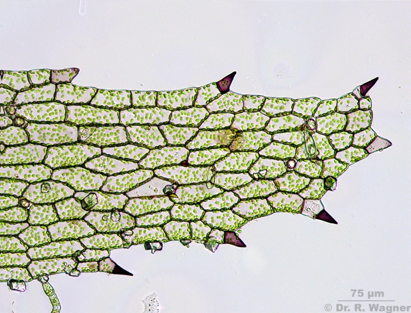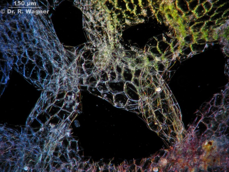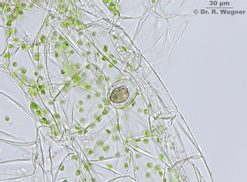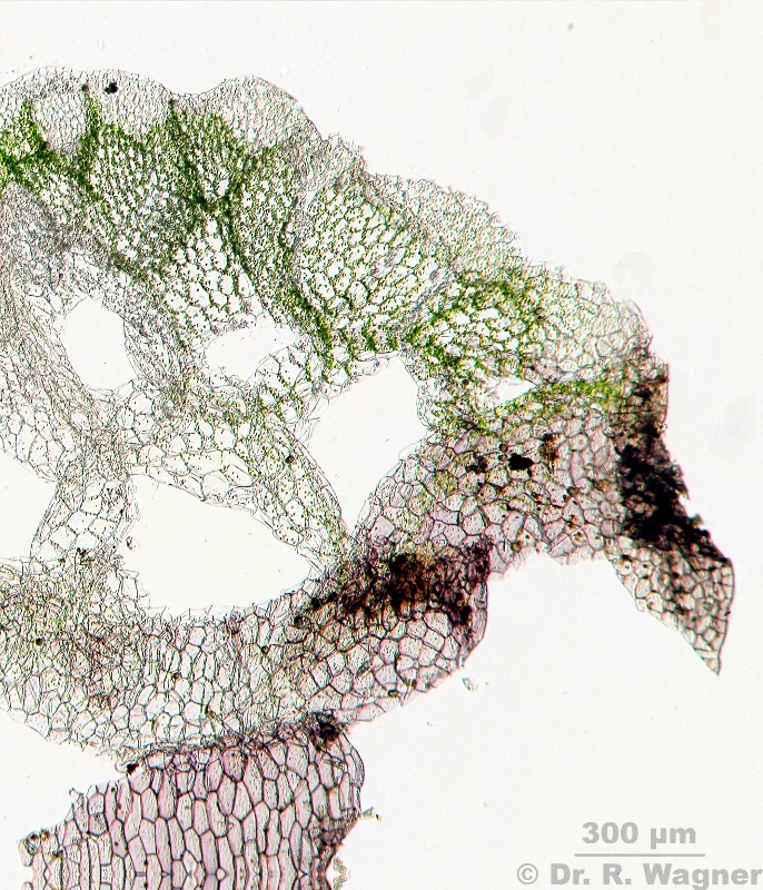 - Blattquerschnitt. Typisch sind die Luftkammern des Assimilationsgewebes und die rötlichen Bauchschuppen.