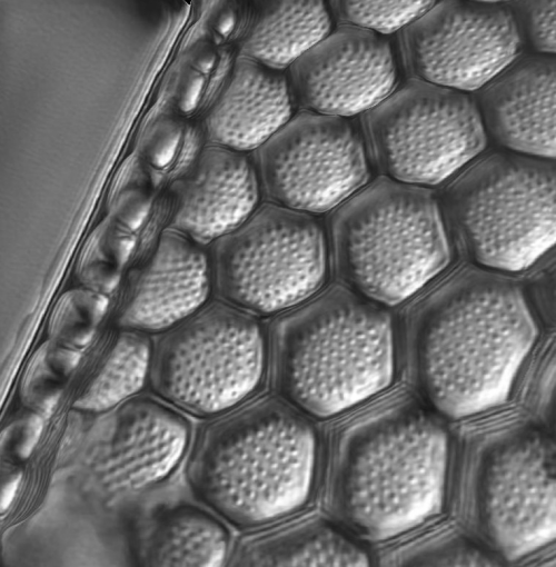 Ich habe nun von Triceratium nur Bilder in begrenzter Qualität. Hier ein gestapeltes davon um +10° und -10° um die Y-Achse gekippt: