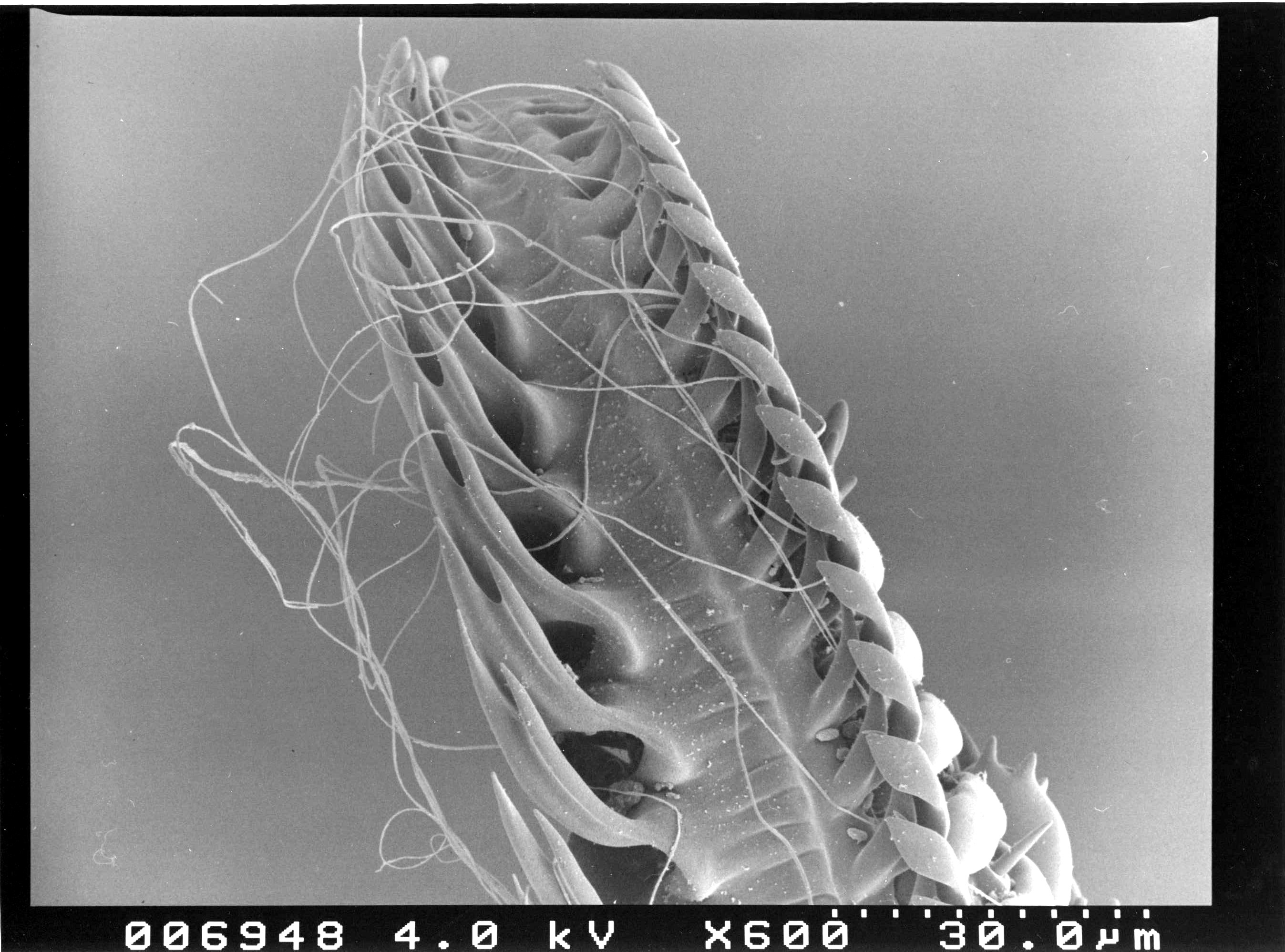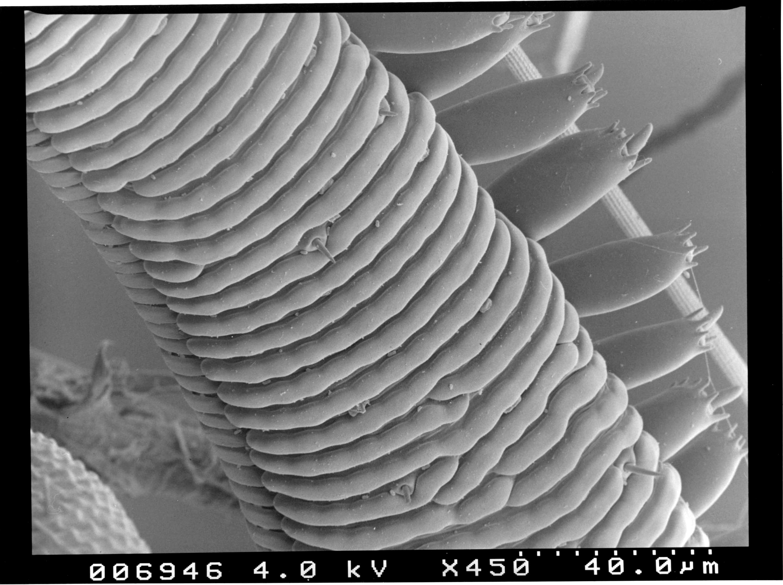 Und etwas genauer der Rüssel im mittleren Bereich, es gibt verschiedene Sensoren und Sinneszellen, 1350x  (bei 20 cm Bildbreite).