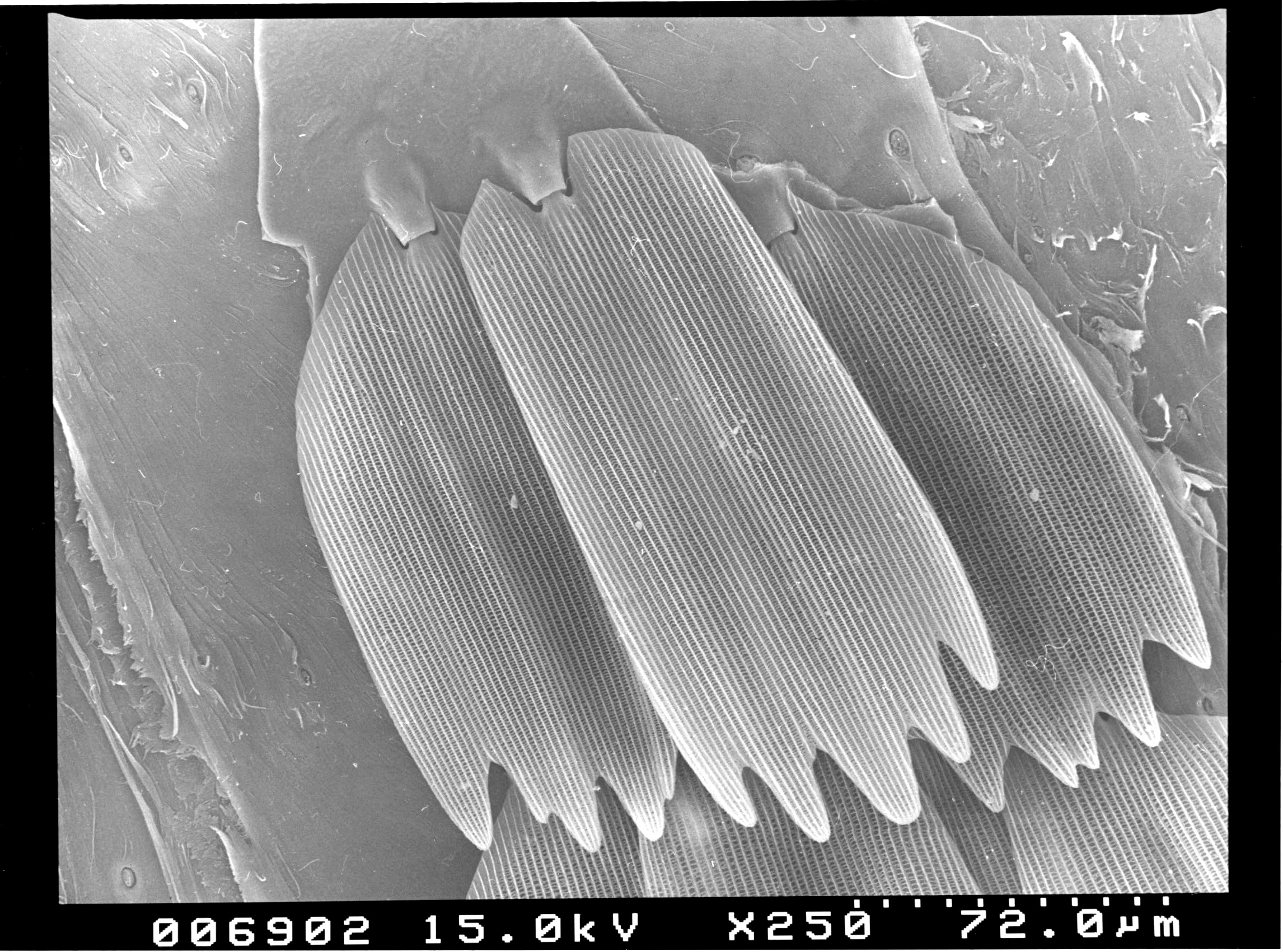 Jorrit's Beitrag zu den Schmetterligsschuppen im REM hat mich gleich wieder an meinen "Erstkontakt" mit der Elektronenmikroskopie in den 90ern an der Uni erinnert. Wir haben damals auch u.a. Schmetterlingsschuppen angeschaut, ich habe die alten Fotos (die wir noch eigenhändig im Fotolabor auf Papier vergrössert haben) mal rausgekramt und gescannt. Die Qualität ist daher nicht immer optimal.