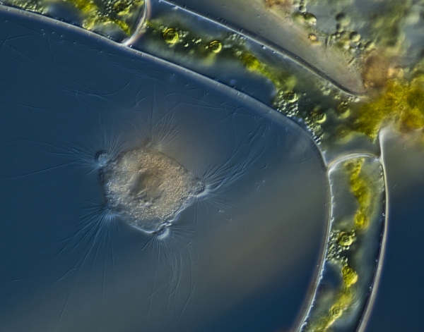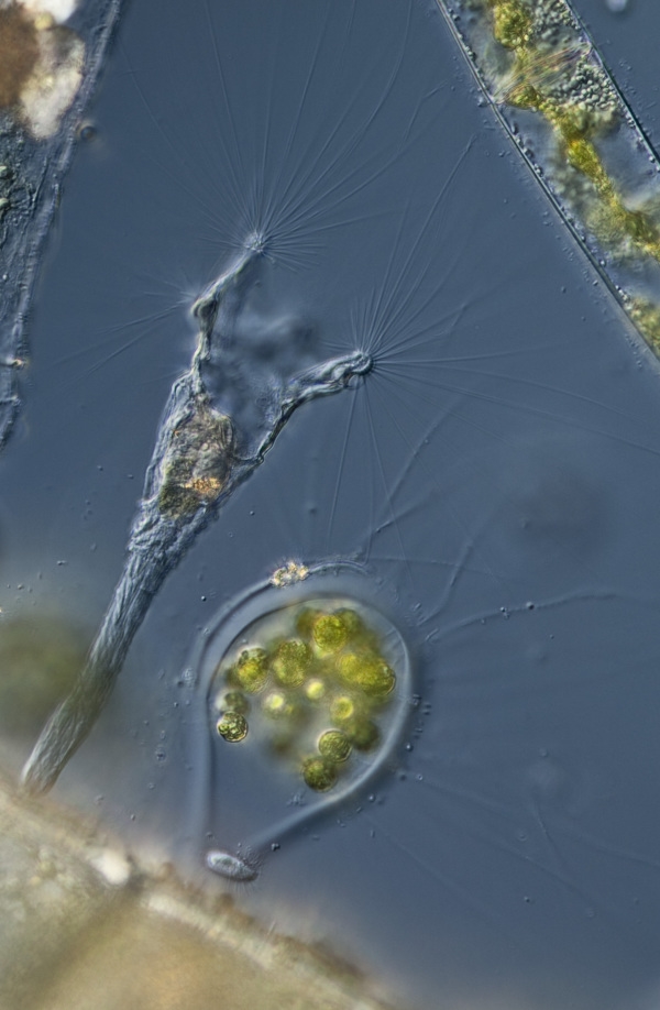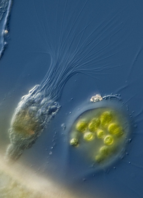 habe im Gartenteich einige Exemplare des Rädertiers Collotheca ornata gefunden. Man sieht ganz gut den Fangtrichter mit seinen langen Fangborsten. Rechts daneben eine Apiocystis braunania.