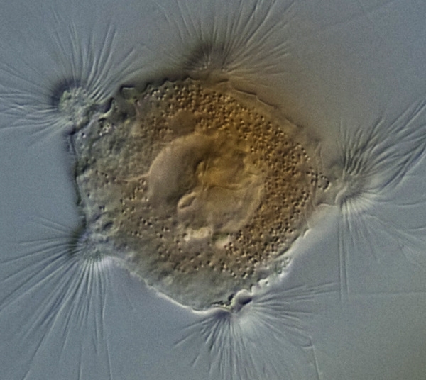 Im nächsten  Bild hat sich das Tier weitgehend kontrahiert. Nur wenn man genau hinsieht, erkennt man anhand einzelner Bakterien, die sich an den Rand angelagert haben, das sehr klare und durchsichtige Gehäuse.