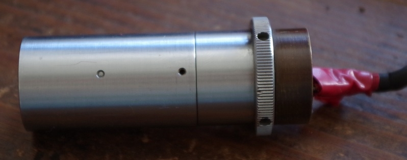 Die schwarze Kappe hinten wurde schon entfernt. Ebenso die Madenschraube (2. Loch von links). Bei dieser Version befinet sich der Exzenter noch an der Leuchte.