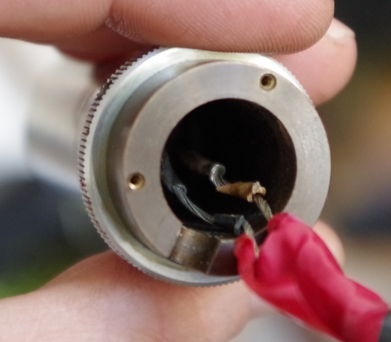 die Kontaktstifte haben ja Schraubenschlitze (2.Foto). Ich nehme an, wenn Du die abschraubst, kannst Du den Teil mit den Drähten hinten herausziehen. Dazwischen wird noch ene Feder sein.