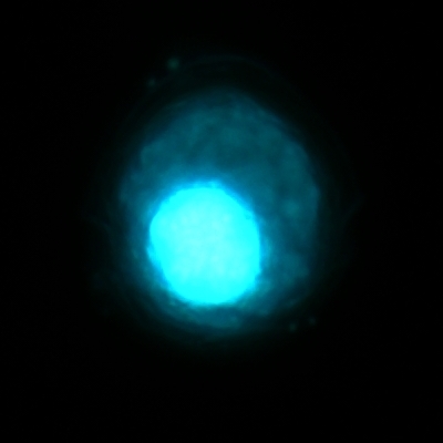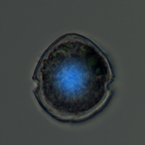 I've fixed cells with ethanol, and stained them with DAPI, a powerful fluorescent DNA stain. It stains the large dinoflagellate nucleus brightly, and it also shows that it is organized in little threads (chromosomes). That is common in dino's, which have such an absurdly high amount of DNA that it is permanently in a condensed state.