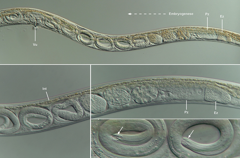In meinen Proben habe ich ausschließlich fertile Weibchen (und Juvenile) gefunden. Schon bei schwacher Vergrößerung fällt auf, dass der Wurm dicht mit Entwicklungsstadien erfüllt ist, die in beiden Uterusschenkeln hintereinander liegen und von einer Proliferationszone (Pz) in Richtung Vulva (Vu) sequentiell reifen. Die Proliferationszone ist gekennzeichnet durch zahlreiche kleine Kerne der prospektiven Eizellen, die in einer syncytialen Plasmamasse liegen und noch nicht voneinander durch Zellgrenzen abgesetzt sind. Die reifen Eizellen (EZ) sind dicht mit Vesikeln erfüllt. Die Stadien der Embryonalentwicklung, bei der man eine Proliferations- und eine Morphogenese-Phase unterscheiden kann, lassen sich in der Richtung der fortschreitenden Differenzierung unmittelbar ablesen. In der Phase der Proliferation kommt es zur raschen Zellvermehrung; in der anschließenden Morphogenese zur Ausbildung der fertigen Organsysteme und zur Bildung der wurmförmigen Körpergestalt.