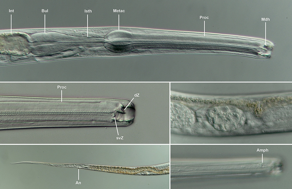 Die von mir gefundenen Tiere leben in dichten Matten von teilweise verrottendem Algenmaterial (u.a. Spirogyra), das ich auf der Oberfläche treibend fand. Diplogaster rivalis hat einen für rhabditide Nematoden typischen Pharynx, der in klar unterscheidbare Abschnitte unterteilt ist (Proc=Procorpus, Metac=Metacorpus, Isth=Isthmus, Bul=Bulbus). Caudalwärts schließt sich das Intestinum (Int) an, kopfwärts die Mundhöhle (Mdh), die einen auffallenden dorsalen Zahn (dZ) sowie kleinere subventrale Zähnchen aufweist (svZ). Die Kutikula des Nematoden ist schwach geringelt, das Amphid (Amph) zumindest bei Weibchen ein nur wenig auffallendes Oval. Hinter dem Anus (An) schließt sich ein langer, fein zulaufender Schwanzabschnitt an.