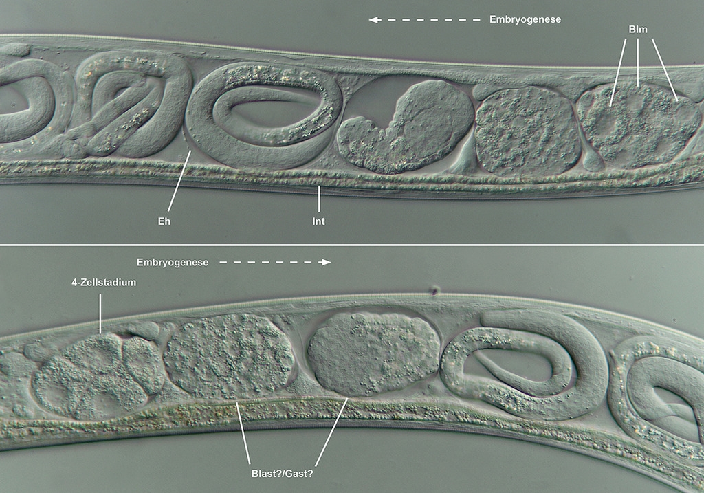 Aus der befruchteten Eizelle entwickelt sich über ein 4-Zellstadium eine Blastula, deren einzelne Blastomeren (Blm) in einem frühen Stadium noch deutlich unterscheidbar sind. Über rasche Furchungsteilungen entstehen die Blastula und Gastrula (Blast/Gast), die ich aber nicht im Einzelnen unterscheiden konnte. Interessanterweise führen die Zellteilungen der Proliferationsphase nicht etwa zu einer Volumenzunahme des Embryos – die ungefurchte Eizelle ist kaum kleiner als ein weit fortgeschrittenes Entwicklungsstadium. In späten Stadien der Morphogenese erkennt man bei den jungen Nematoden schon die kutikularen Differenzierungen der Mundhöhle (Pfeile). An günstigen Stellen des Präparates sieht man auch die feine Embryonalhülle, die die Embryonen umgibt. Bemerkenswert finde ich, wie stark das Intestinum an den Rand der Leibeshöhle gedrängt wird. Möglicherweise sind die trächtigen Weibchen schon in einer Phase ihres Lebenszyklus, in der die Nahrungsaufnahme gegenüber der Reproduktion in den Hintergrund getreten ist.
