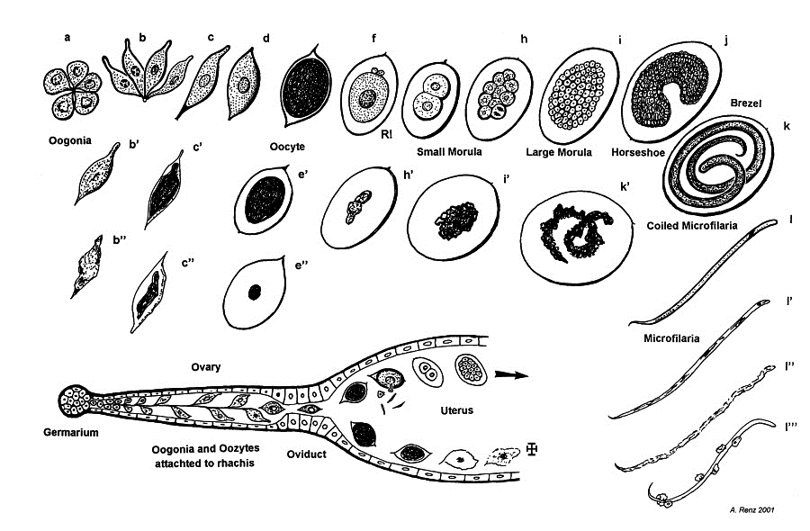 Wobei man sich vor Augen halten muss, dass die reifen Mikrofilarien nur 280 µm lang sind und das Weibchen nur knapp 1/4 mm stark ist, bei einem Verhältnis Durchmesser zu Länge von weniger als 1: 1000. Deshalb der Name 'Fadenwürmer', Filarien (die Familie wurde vom Tübinger Zoologen Gmelin ca. 1790 so benannt). Das Interessante dabei ist, dass die Spermien den weiten Weg von der ganz nahe am Vorderende gelegenen Vulva bis dem dem im hinterste Ende des Weibchens gelegenen Ovidukt durch amöboide Bewegung mühsam 'zu Fuß' zurück legen müssen. Spermien von Nematoden besitzen nämlich kein Flagellum, mit welchem sie sich schnell schwimmend den Oozyten nähern könnten.