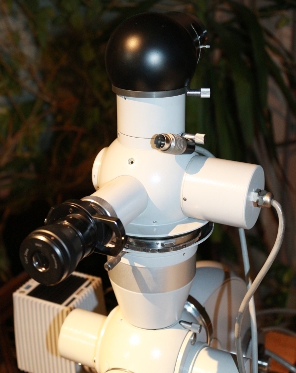 Meine Vermutung ist, dass der zweipolige Rundstecker am seitlichen Flansch eine Art Sicherung bediente: Um zu verhindern, dass ein 'ungedämpfter' Lichtstrahl aus der HG-Lampe versehentlich auf den Multiplier fällt und diesen ruiniert. Man kann den runden grauen Flansch um ca. 90 Grad um die eigene Achse drehen und so den Strahl entweder nach vorne ins Beobachtungsokular oder nach oben in den Photomultiplier lenken.