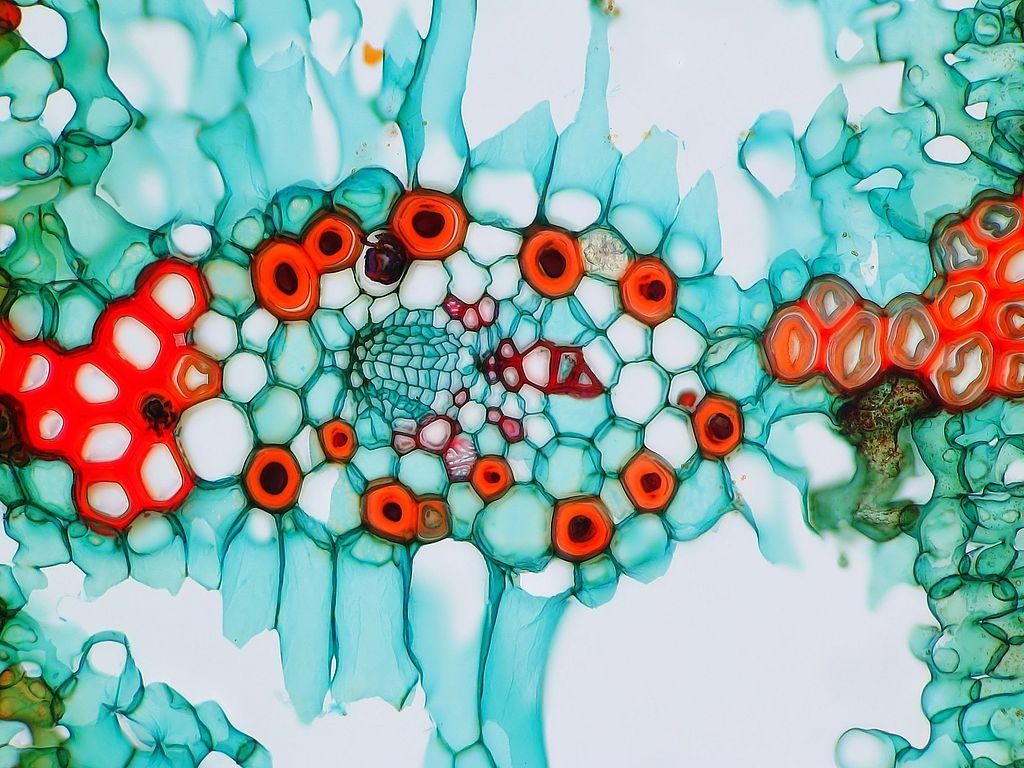 Um die Zellen des Leitbündels herum finden wir die lang gestreckten Sklerenchymfasern mit dem charakteristischen roten Kern. Dieser ist eigentlich der Hohlraum, den die Zelle vor ihrem Absterben "bewohnt" hat. Durch die Länge der Faser und den geringen Durchmesser des Hohlraums halten die hier wirkenden Kapillarkräfte das am Anschnitt eingedrungene Acridinrot aus dem ersten Färbegang der Dujardin-Grün-Färbung sicher fest.