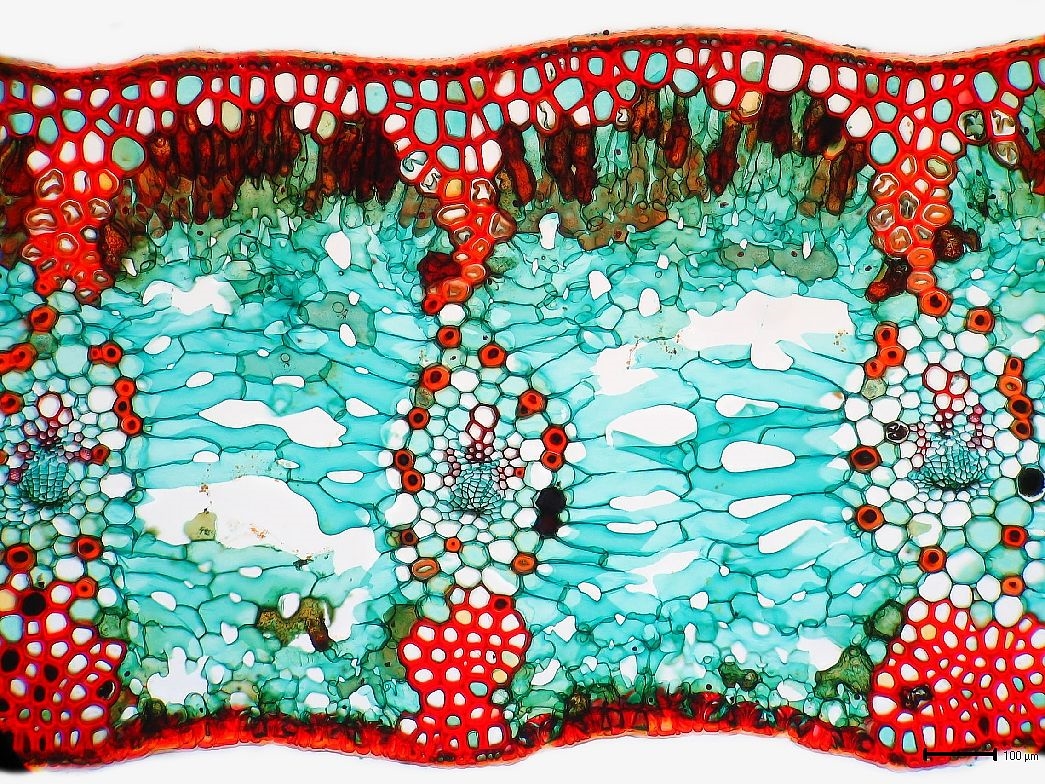 Durch Sklerenchyme und die mittig darin eingebetteten Leitbündel wird das Blatt quasi in einzelne Kammern unterteilt. Diese streifige Struktur ist auch makroskopisch beim Blick auf das Blatt gut zu erkennen. Auch hier sehen wir schon sklerenchymatische Fasern, wie wir sie von Dioon edule kennen.
